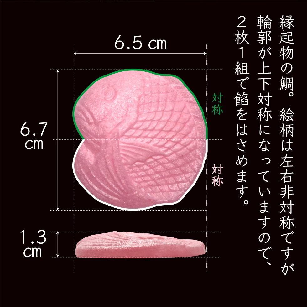 縁起物の鯛。絵柄は左右非対称ですが輪郭が左右対称になっていますので、2枚1組で餡をはさめます。